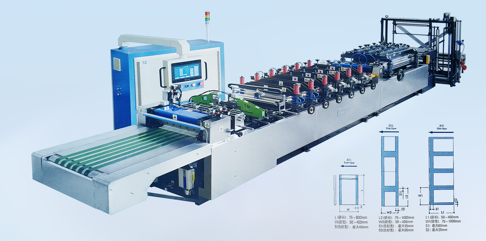 材料:各種復(fù)合薄膜。 卷筒:寬度≤1200mm,直徑≤800mm。 制袋速度:180段/分(機(jī)械設(shè)計速度)約<40m/min。 制袋寬度:≤500mm。 制袋長度:50-400mm,制袋長度超過400mm 以上應(yīng)采用倍送功能。